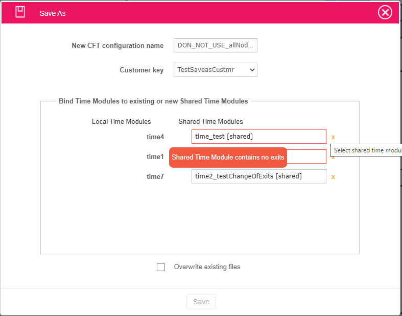 The Save button in Save-as wizard gets disabled when at least one of the SharedTime modules chosen in mapping form is empty - has no exits defined in its KML data.