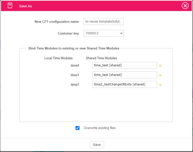 Choose from “Save version” menu the “Save as…” option - The Save-as wizard displays, by default listing: original customer in field “Customer key”; SharedTime modules from original customer’s data refered by the BoundLocal modules in configuration.