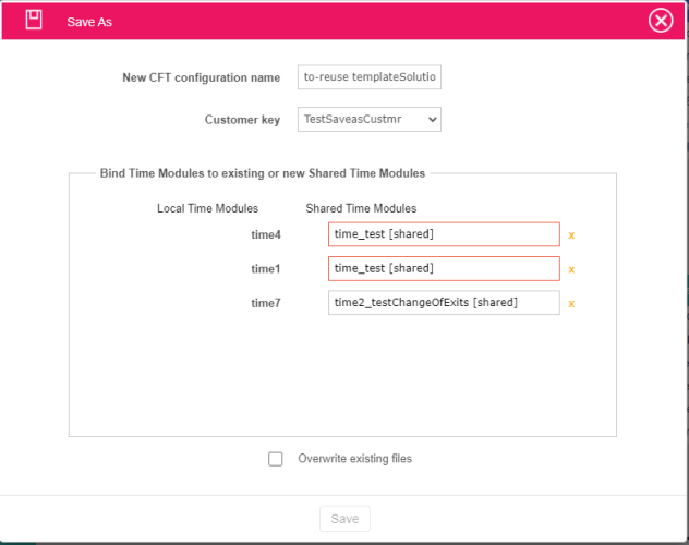 Choose from “Save version” menu the “Save as…” option - The Save-as wizard displays, by default listing: original customer in field “Customer key”; a “Bind Time Modules to existing or new Shared Time Modules“ mapping between SharedTime modules from original customer’s data and the BoundLocal modules in configuration referred by them.