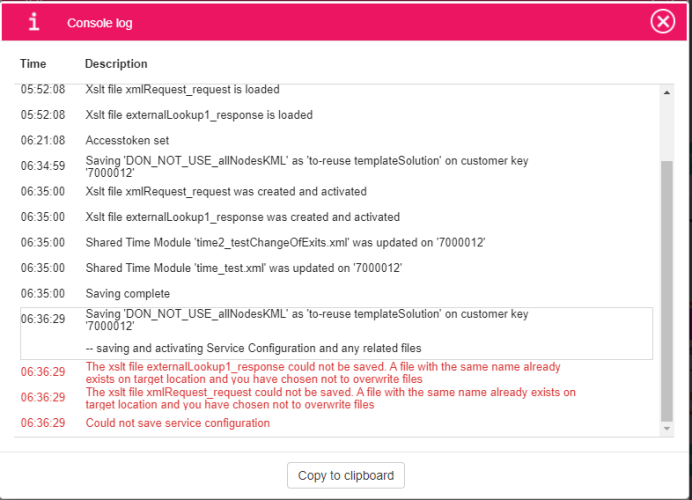 for every XSLT file from the original customer’s data, for which an XSLT file with the same URI exists in target customer’s data - no changes are made to target XSLT file, an error for failed XSLT save is reported in CFT Console;