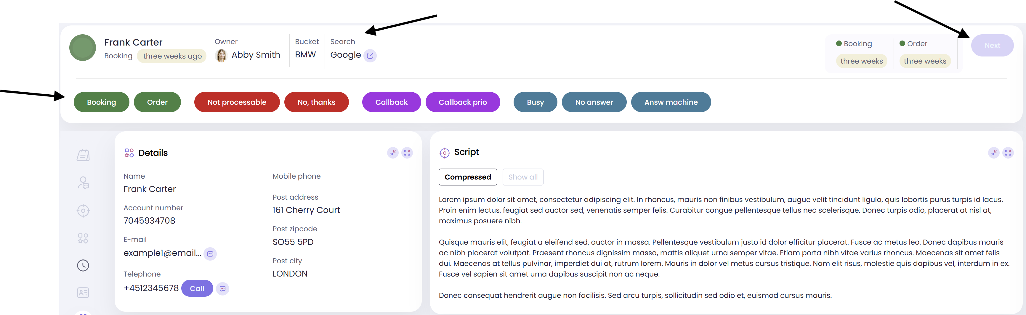 - Clicking the Next button will either load the next customer card or make you available for the dialer.