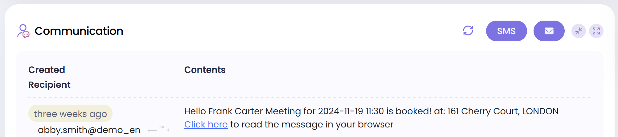 The communication log holds information about SMS messages and emails sent to and received from the customer or the customer card. The sources of these communications are typically confirmations, reminders, or general mailings.