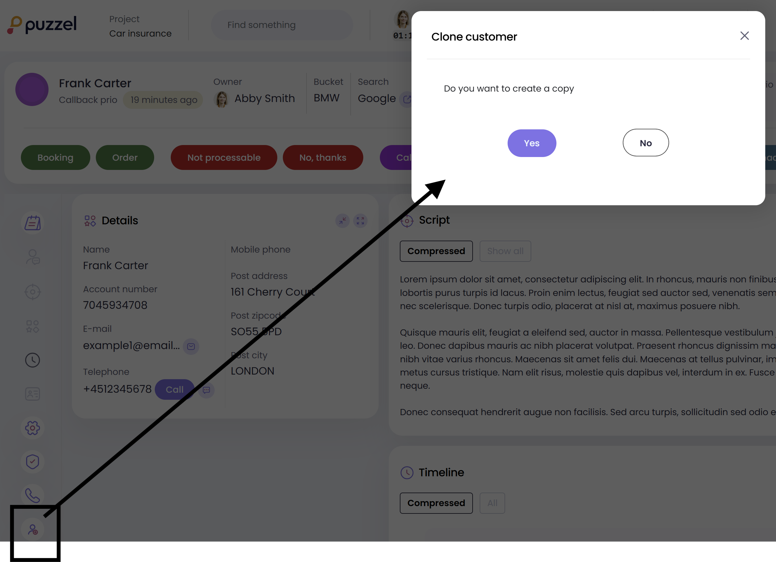 Click the Clone Customer button in the toolbar to create a copy of the existing customer card.