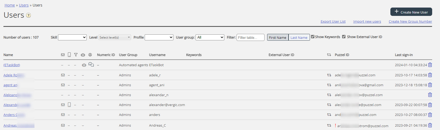 Brugeradministration Danish EnglishDanishNorwegian BokmålSwedishDutch I dette afsnit forklares det, hvordan du opretter og vedligeholder brugerne i administrationsportalen til Puzzels kontaktcenterløsning. Back to Top Book traversal links for User management ‹ Previous article Return to section home Next article ›