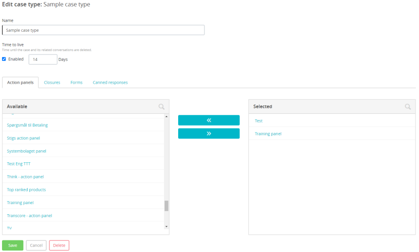 4. In the Action panels, select the action panels you wish to include with the case type. The selected ones will appear on the right. Click Save before you proceed to the next tab.