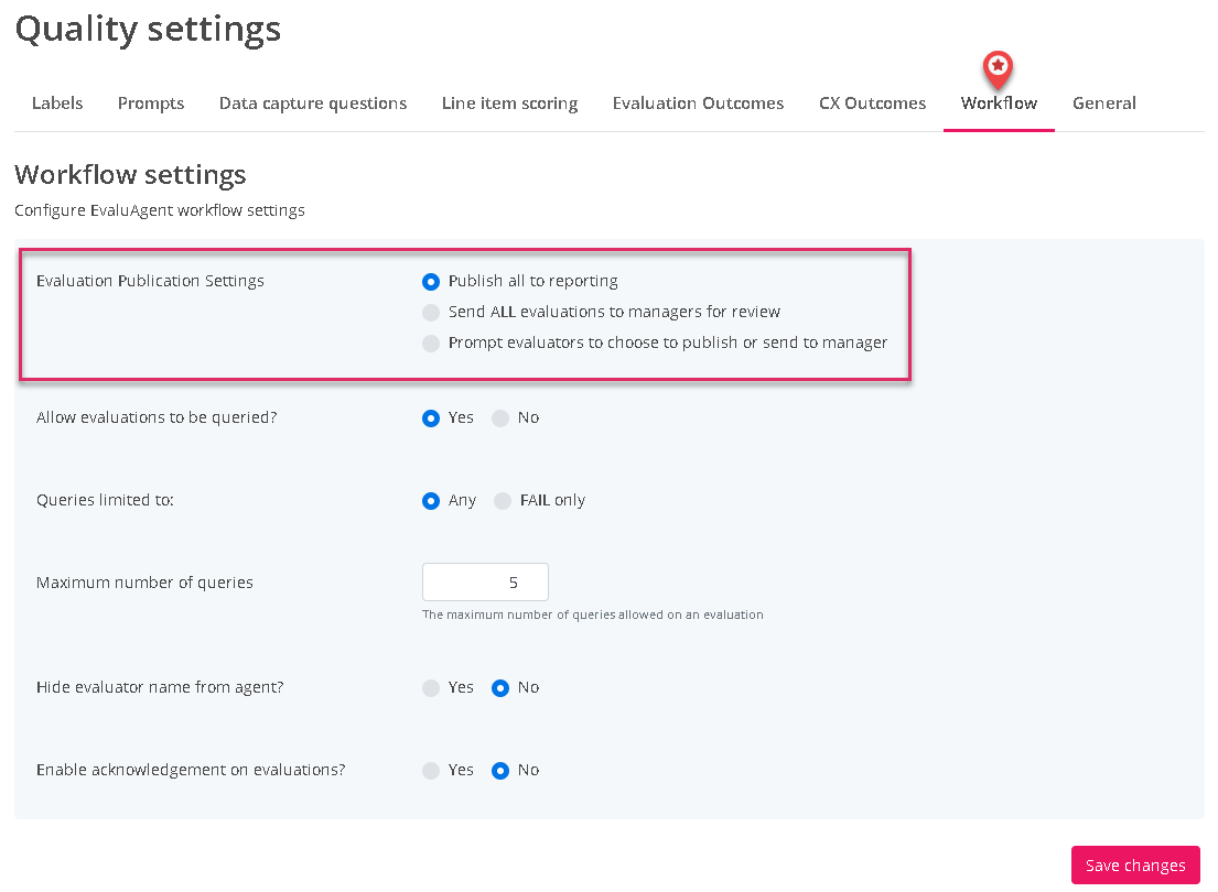 The setting is defaulted to Publish all evaluation straight to reports. If you wish to activate the feature simply select one of two available options: