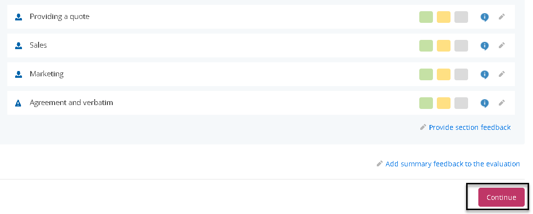 If you have configured evaluations to be reviewed prior to publication, then the Publish button at the end of the evaluation screen is replaced by a Continue button.