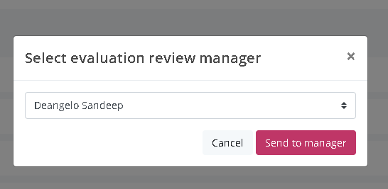 If you've configured all evaluations to be reviewed, on pressing Continue, the following modal pop-up appears and you simply select the Manager who will review the evaluation. Remember, the list of Users available are those Users who have been granted system permissions to review and publish evaluations. (We've kept it deliberately flexible in this respect).