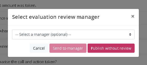 Alternatively, if you've configured evaluators to make the decision between publish without review or send to a manager for review, then the modal pop-up is similar, but includes the additional option to publish the evaluation straight to reports.