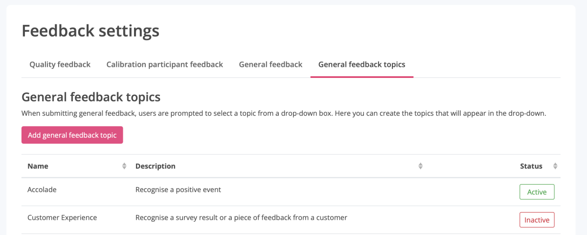 Active topics will be made available for selection when you provide general feedback, you can report on these too! To hide a topic, simply make it Inactive by clicking the Active pill.