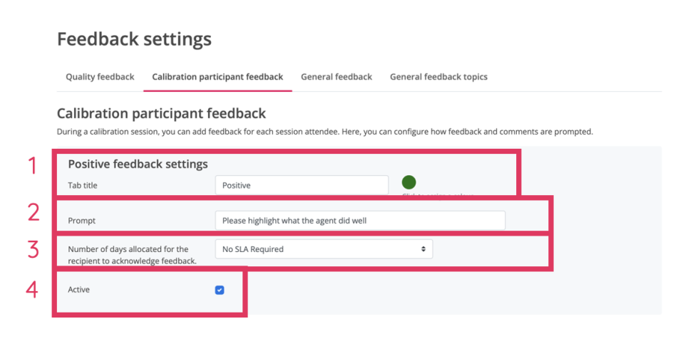 - Part 4: Status - The system enables you to prompt up to three different types of feedback for calibration participant feedback. However, If you only wish to prompt one or two types of feedback (rather than all three options), simply untick the relevant Active status. Feedback option(s) that are un-ticked will NOT be presented to facilitators. (Please note: Whenever a feedback option is made inactive, any feedback previously entered under said option will still be visible in reports).