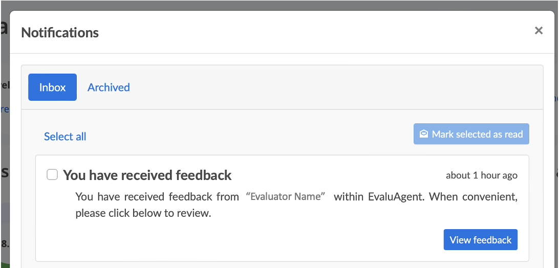 The platform includes a number of actions that relevant parties are notified about any time an action is completed. For example, every time an evaluation is published, the relevant agent is notified.