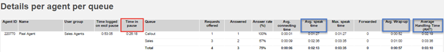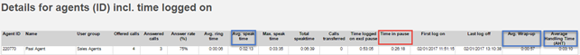 Both these agent reports show per agent the Avg. speaktime, Avg.wrap-up, AHT, Time logged on ex pause and the total Time in pause, but they do not show time per pause reason. If agents spend time in a pause reason (e.g. Outbound prep.) between outgoing calls, this time is included in Time in pause.