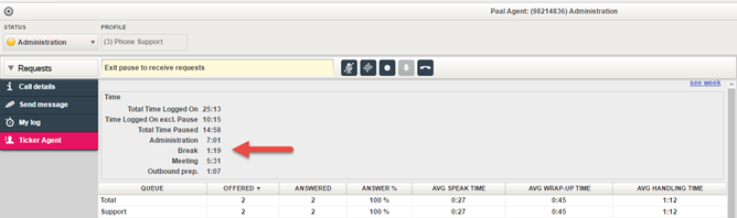 The time in status Connected (speak time), in Wrap-up and the total time in Pause is reported in Real-time Ticker User group/Agent and in Statistics reports Details for agents incl. time logged on and Details per agent per queue. The time spent per pause reasons is shown in Ticker, but in Statistics this is only shown in report Time per pause reason.