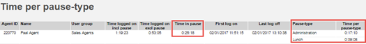 Report Time per pause type shows per agent the Time logged on incl pause, Time logged on excl pause, Time in pause and in addition, the Time per pause type.