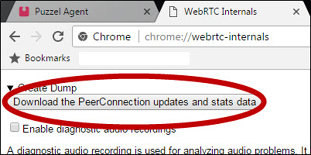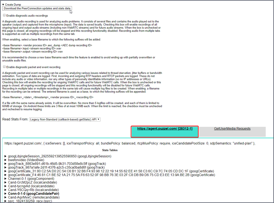 The “chrome://webrtc-internals” facility is an internal Google Chrome tab that holds statistics about ongoing Softphone calls and their audio data. This log can be analysed by Puzzel engineers to help determine the cause of issues relating to call quality with the Softphone.