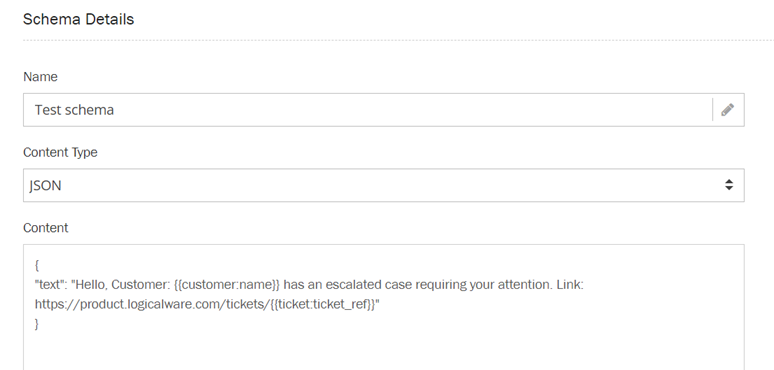 8. Create your Schema: Settings -> Integrations -> Outbound Integrations -> Schemas.  Then click “New Schema”.  Give your Schema a Name, Content Type: JSON.  Content should be written in the following format: