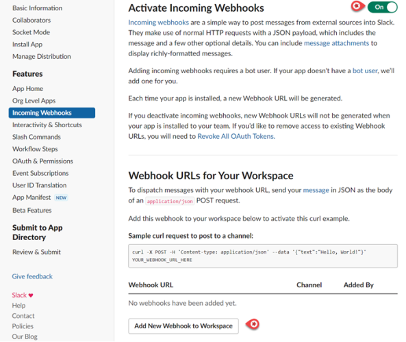 4. Click on Incoming Webhooks box and toggle Activate Incoming Webhooks option to ON.  Click on Add new Webhook to Workspace.