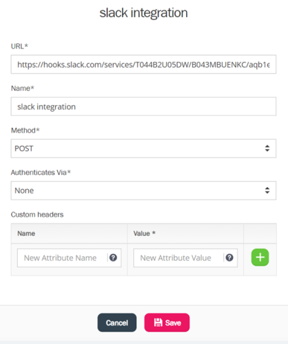 7. In Puzzel Case Management, click on Settings -> Integrations -> Outbound Integrations -> Webhooks.  Click on New Webhook and copy the URL from Slack into the URL bar.  Give your Webhook a name, make sure Method is set to POST, and Authenticates via is set to None.  Click Save