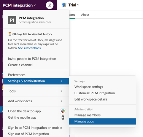 1. Click on your Slack workspace name at the top-left-hand side and navigate to Settings & administration -> Manage apps to open the Slack app directory.