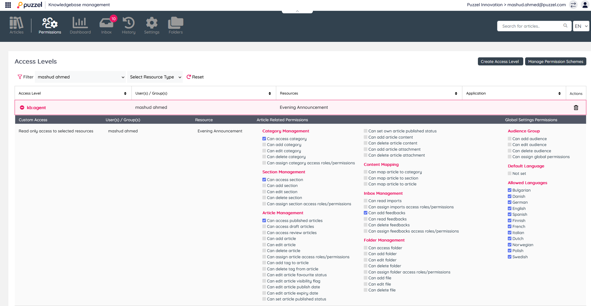 It is possible to expand the access level to view the complete permission scheme associated with an access level which are categorised and listed as follows: