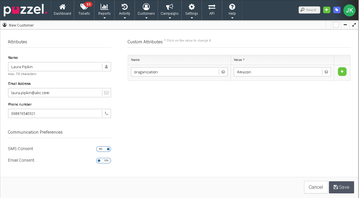 Klikk på Ny Kontakt valget vist i figuren for å åpne vinduet der du kan legge til kundedetaljer og trykk på Lagre. I tillegg til de åpenbare valgene, kan du også legge til kundeattributter som organisasjon, rolle, avdelinge osv.