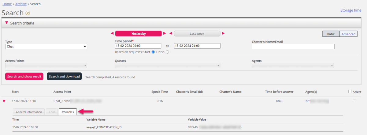 Selecteer Type = Chat en voer uw zoekcriteria in. Wanneer u op "Zoeken en resultaat tonen" klikt, verschijnen de chats die aan uw zoekcriteria voldoen.