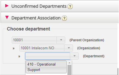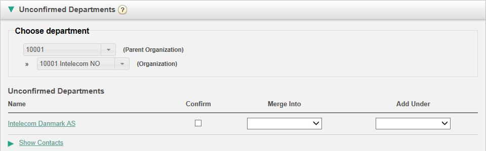 Als het afdelingsveld automatisch wordt gesynchroniseerd/geïmporteerd, moet u als beheerder deze bevestigen zodat de afdelingen tot de catalogus behoren en aan de hiërarchie worden toegevoegd. Deze afdelingen zullen automatisch de contactpersonen bevatten die een specifieke gesynchroniseerde afdeling in hun afdelingsveld hebben.