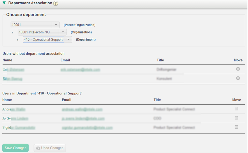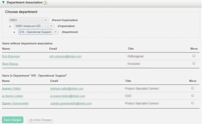 Indien u een gebruiker wilt verplaatsen van de huidige afdeling naar de nieuwe afdeling, vink dan het vakje “Verplaatsen aan” en klik op “Wijzigingen opslaan”. Nu zal deze gebruiker tot geen enkele afdeling behoren. De gebruiker zal in de eerste tabel verschijnen, zodat u de gebruiker naar de juiste afdeling kunt verplaatsen.
