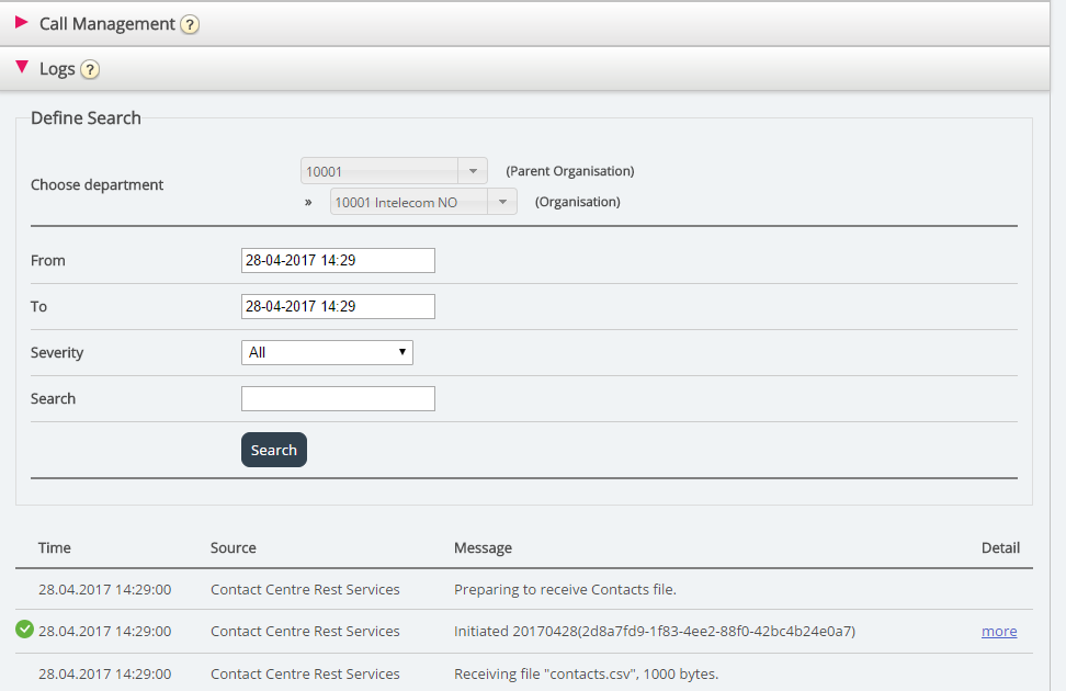 HHier kunt u zoeken naar wijzigingen en waarschuwingen voor de gekozen organisatie. Kies een tijdspanne, de ernst (Info, Wijziging, Waarschuwing, Fout of Alle), typ uw tekst en klik op “Zoeken”.