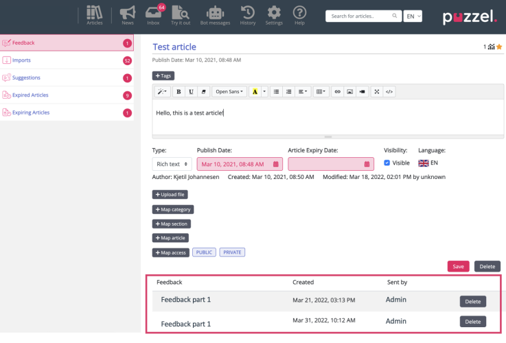 Beheerders kunnen nu een lijst bekijken van alle artikelen met feedback van agenten in een nieuwe lijstweergave. Door op het artikel met een feedback te klikken, wordt het artikel geopend in de bewerkingsmodus en vindt u de bijbehorende feedback onderaan de pagina. Nadat de feedback is beoordeeld, kan deze worden verwijderd met behulp van de verwijderknop.