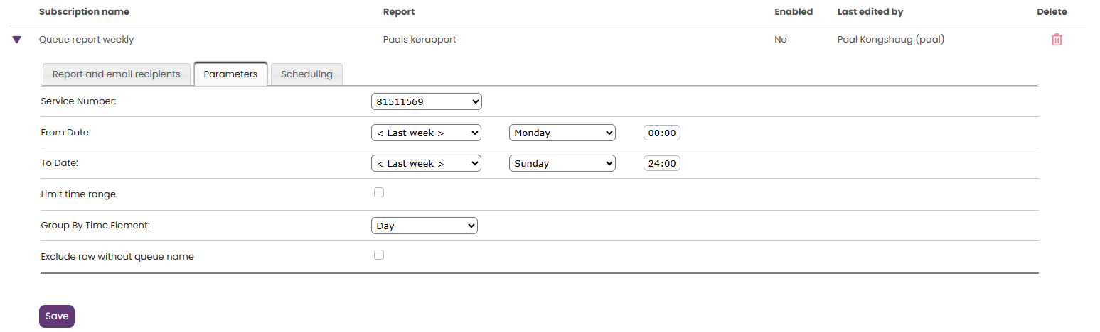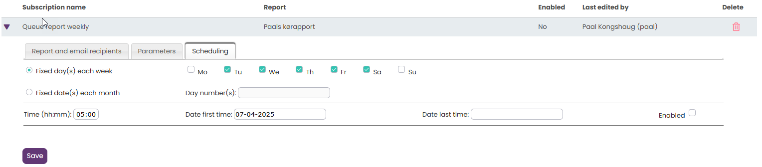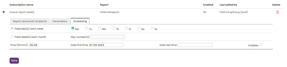 Als u het rapport voor meerdere vaste data wilt versturen, gebruik dan een puntkomma tussen de data. Om een abonnement te activeren, vinkt u het vakje “Ingeschakeld” aan en slaat u het op.