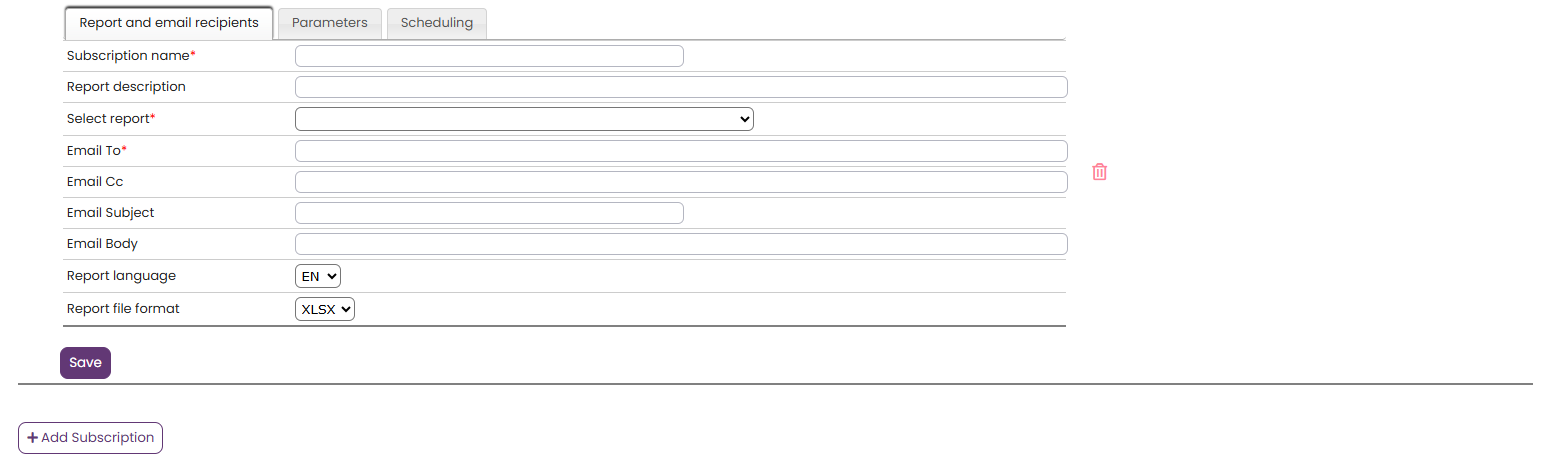In dit tabblad moet u een rapport kiezen, informatie invullen zoals de naam van het abonnement, de beschrijving van het rapport, de ontvangers van het e-mailbericht en het bestandsformaat kiezen.