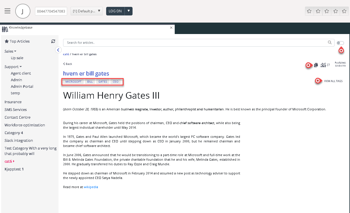Het tabblad “Kennisbenk” kan gebruikt worden om informatie over een product/dienst te zoeken. U kunt gewoonweg door de best beoordeelde artikelenbladeren om uw kennis te vergroten tijdens een pauze of op zoek gaan naar relevante artikelen tijdens een klantinteractie. De beste artikelen worden altijd weergegeven in het middenpaneel wanneer het tabblad voor het eerst wordt geopend.
