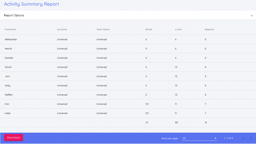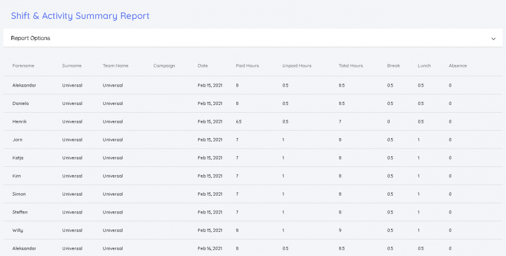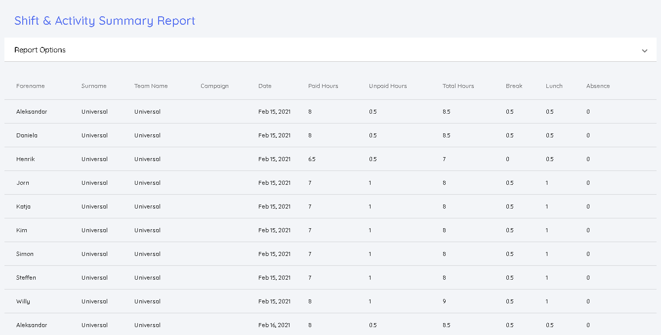 Dit is een samenvattend rapport over het totaal aantal gewerkte uren van een agent en de tijd die besteed is aan andere activiteiten zoals lunch en pauzes. Het vermeldt ook het aantal dagen afwezigheid voor elk individu, als dat er is. U kunt ook de knop Aggregeren aanzetten om het rapport te genereren dat de samenvatting van elke agent over een bepaalde periode afleidt.