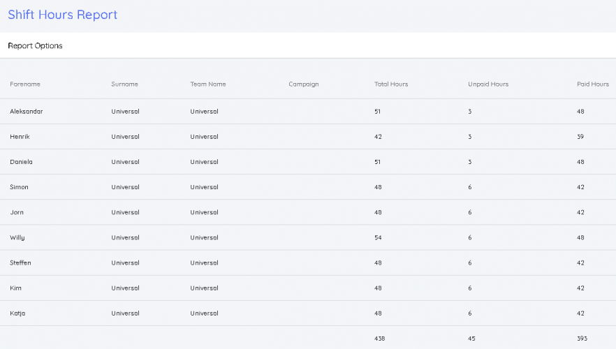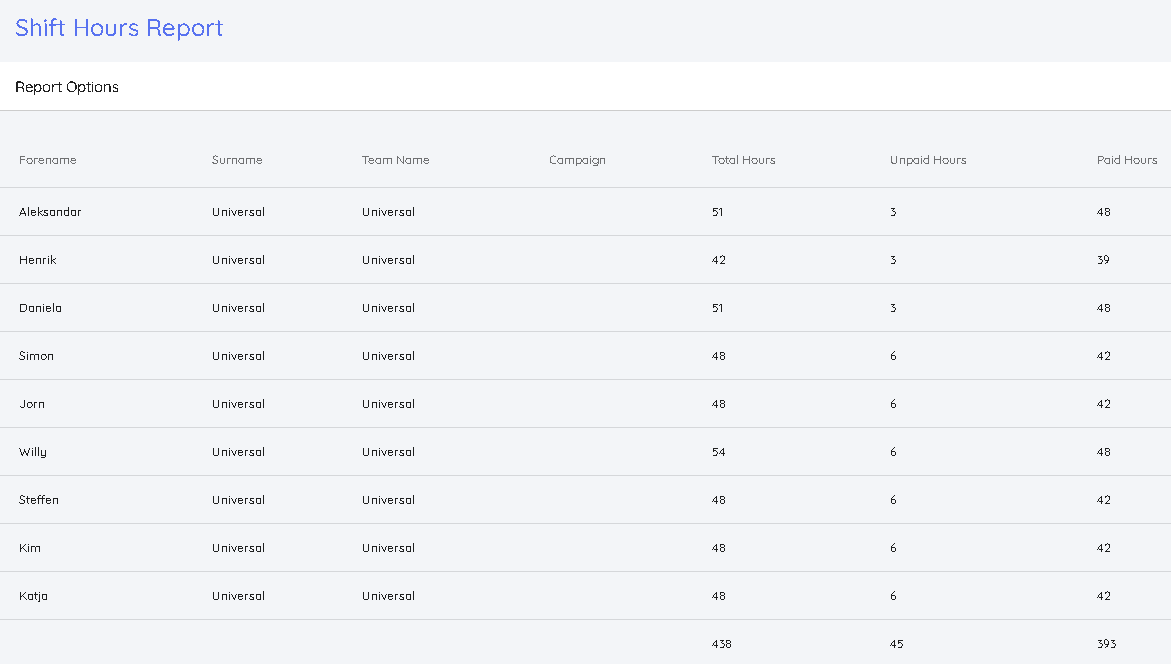 Dit rapport geeft een gedetailleerd overzicht van het totaal aantal uren dat door elke agent gewerkt is, verminderd met de onbetaalde uren [ lunchpauze enz]. U kunt dit rapport ook genereren voor alle agenten die bij een campagne betrokken zijn of voor een individuele agent.