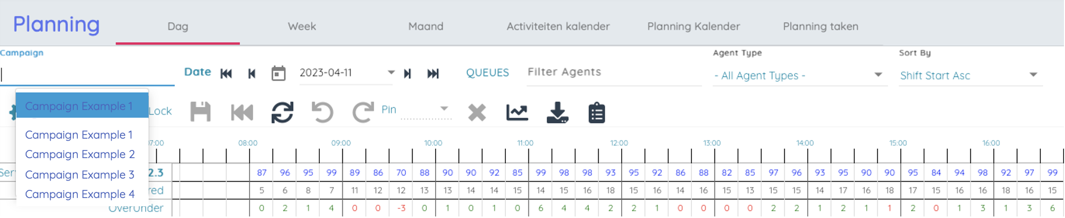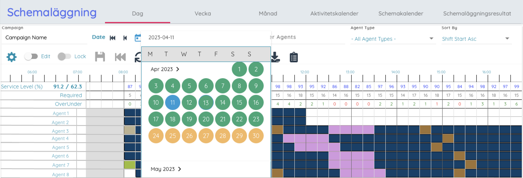 De weer te geven datum wordt gekozen door op de weergegeven datum te klikken of op de kalenderknop die een kalender weergeeft om de gewenste datum te kiezen. In de kalender zijn de geplande dagen groen gemarkeerd en de gepubliceerde dagen blauw.