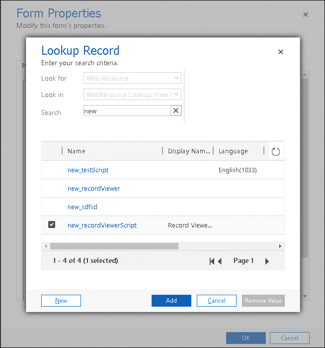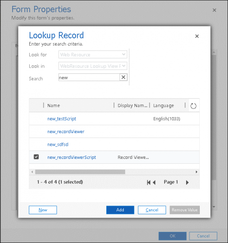 - In the Lookup Record window, search for new_recordViewerScript and click Add