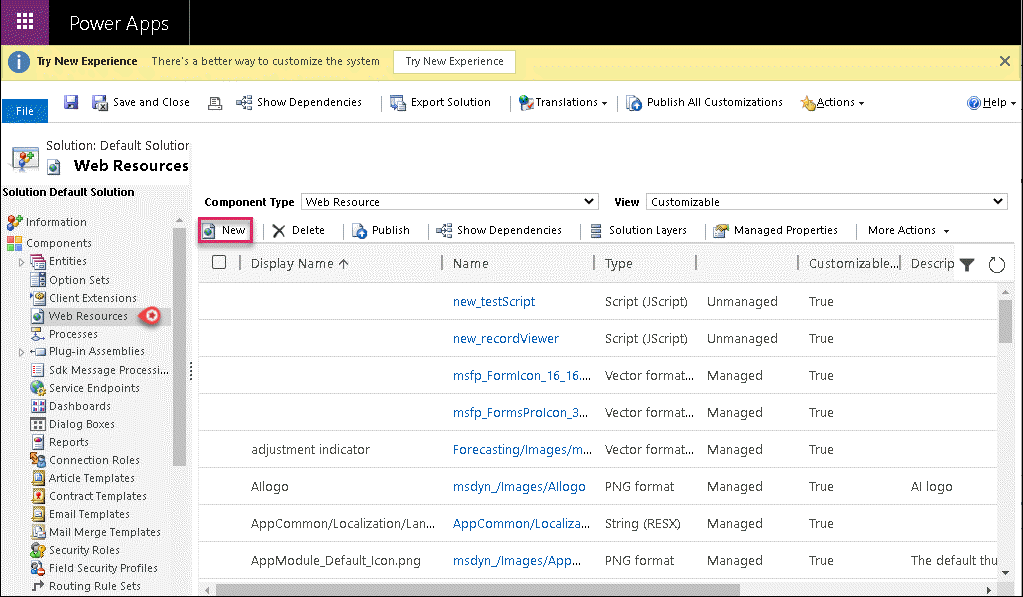- From the tree structure on the left, select Web Resources under Components and click on New to create a new resource