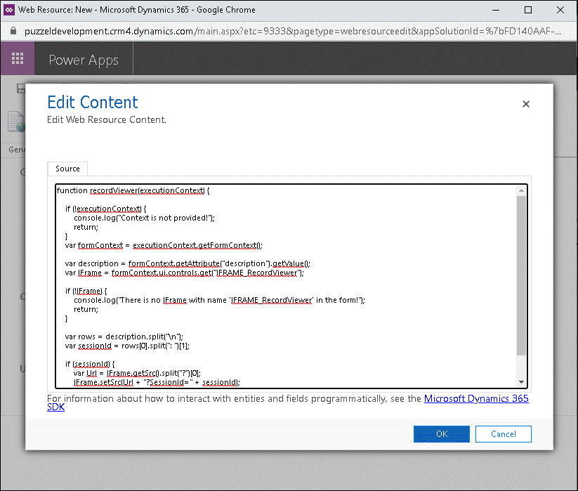 function recordViewer(executionContext) { if (!executionContext) { console.log("Context is not provided!"); return; } var formContext = executionContext.getFormContext(); var description = formContext.getAttribute("description").getValue(); if(!description) { return; } var IFrame = formContext.ui.controls.get("IFRAME_RecordViewer"); if (!IFrame) { console.log("There is no IFrame with name 'IFRAME_RecordViewer' in the form!"); return; } var rows = description.split("\n"); if(!rows || !rows[0]) { return; } var sessionId = rows[0].split(": ")[1]; if (sessionId) { var Url = IFrame.getSrc().split("?")[0]; IFrame.setSrc(Url + "?SessionId=" + sessionId); } } - Save, Publish, and close the window