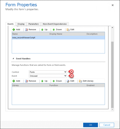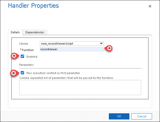 - Click on the Add button to open the Handler Properties window. Enter RecordViewer for the Function parameter and tick Enabled. Under Parameters section, check Pass execution context as first parameter and click OK