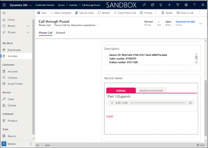 The record viewer allows you to view chat transcripts and listen to call recordings archived in the Puzzel application. It is a passive tool which simply permits you to access the archive after having authenticated into the Puzzel Application. By making the records available within Dynamics, the agents can go through the previous interactions with the customer and provide a greater customer service.