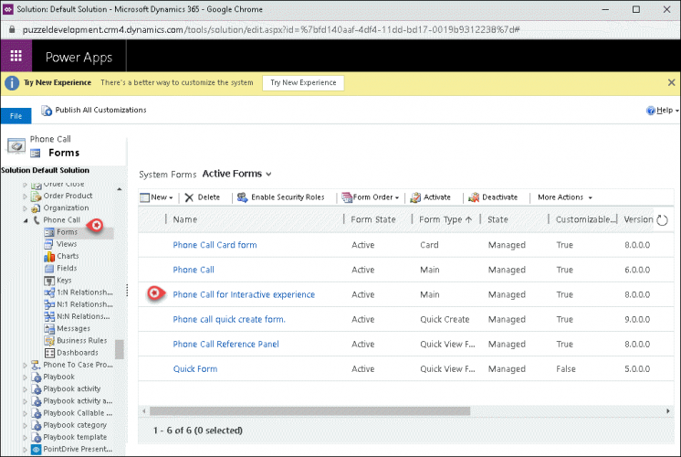 - From the tree structure on the left, select Entities -> Phone Call ->Forms and click on the Phone Call for Interactive experience option