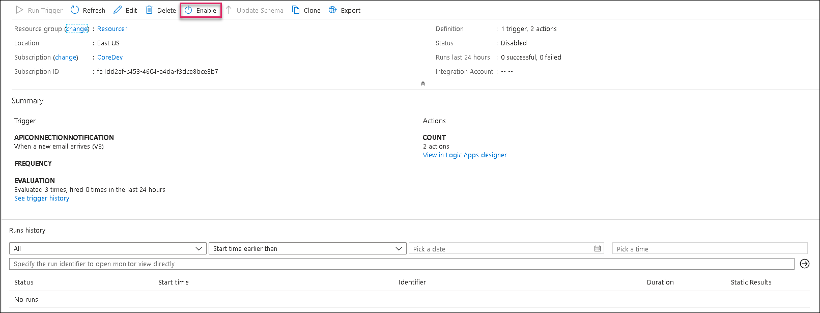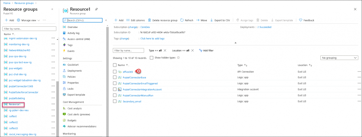 - Navigate to the Resource groups and select the resource group you created. Click on the PuzzelConnectorEmailTriggered option and Enable it