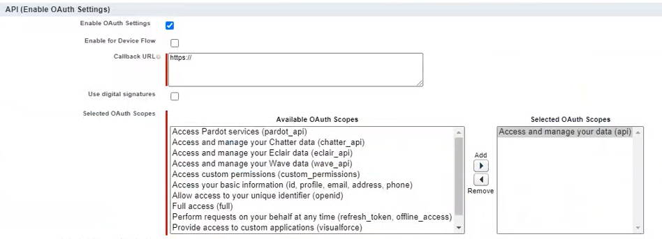 - Select Enable OAuth Settings under API(Enable OAuth Settings) section. This will now display the options under it