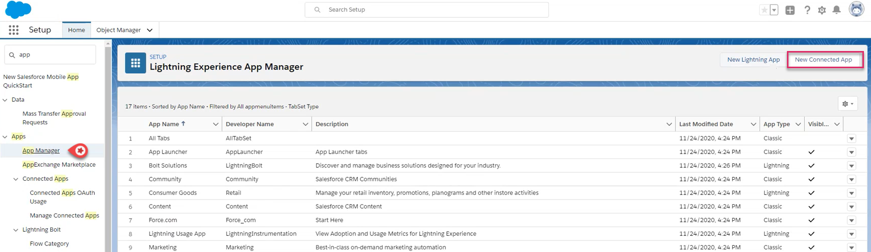 - Go to quick finder and type App Manager. Select App Manager from the results displayed as shown in the figure below. Click on New Connected App option found on the top right corner.