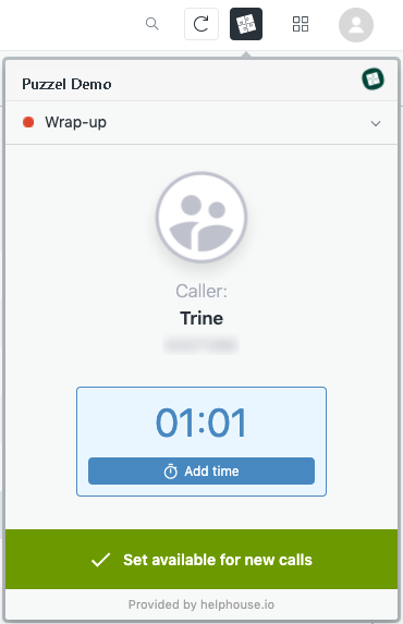 After a call is ended, you will see a wrap-up view with a counter that counts down. To get more wrap-up time, click the “Add time” button, and one minute will be added to the counter. When the counter reaches 0 you will be set as available and ready for new calls. If you are finished before the counter has finished, click the “Set available for new calls” button.