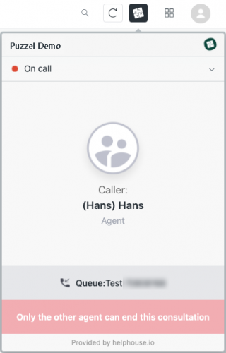 When the consultation call comes in, you will be shown the name of the agent calling you. When accepted, you are presented with a view displaying the agent name and call queue. You are not able to hang up the call, so for the consultation to end, the agent who called you must hang up or transfer the call. If they end the consultation, the wrap-up view will be shown, and if they transfer the call to you, the call will be shown.