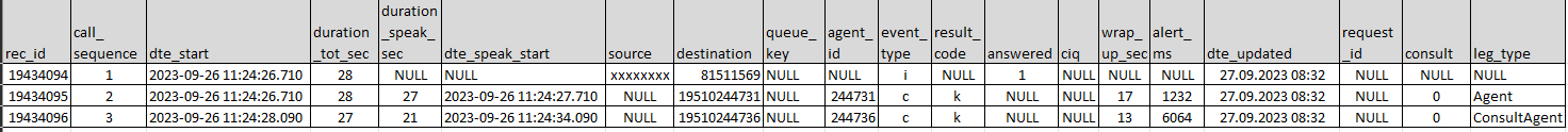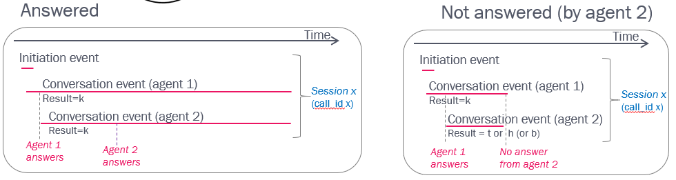 If the call to the destination number is not answered, the conversation event to the destination will usually have result h (=agent clicks Hang up while it’s ringing) or t (ringing timeout for call to destination), and the speaktime in the Conversation event for the agent will usually be 15-30 seconds.