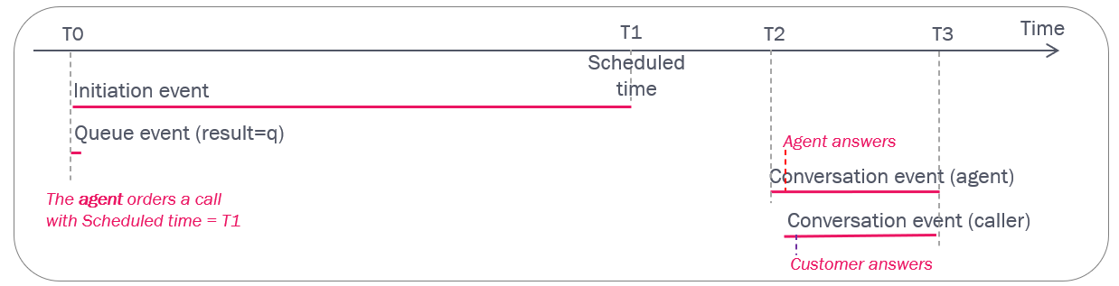 - At T0, the agent orders a Scheduled call with a scheduled time (T1) in queue X. An initiation event (duration from T0 to T1) and a queue event (duration = 0) is created and these records appear in the Raw data db shortly after T0.